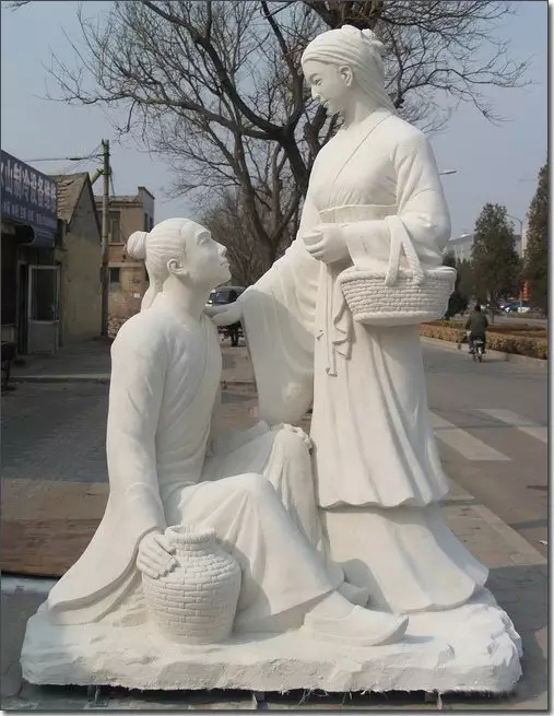 其實我更喜歡制作成功的玻璃鋼雕塑作品,漂母的優(yōu)雅婉約,嫻靜恬淡,眼神中的憐惜與鼓勵,都在一顰一笑一個衣褶一個提動態(tài)中體現(xiàn),仿真石材的效果讓韓信的體態(tài)更顯堅實,所說是落難英雄,看到韓信仰望漂母的感覺,感恩之心悠然而生,或許這就是此雕塑所表現(xiàn)的真實意義吧。漂母韓信玻璃鋼雕塑最終的安放地點是淮安的一所中學(xué),仰望古人,心懷感恩,后世不忘前世之師,念卻先閑展望未來,懷古論今繼往開來。